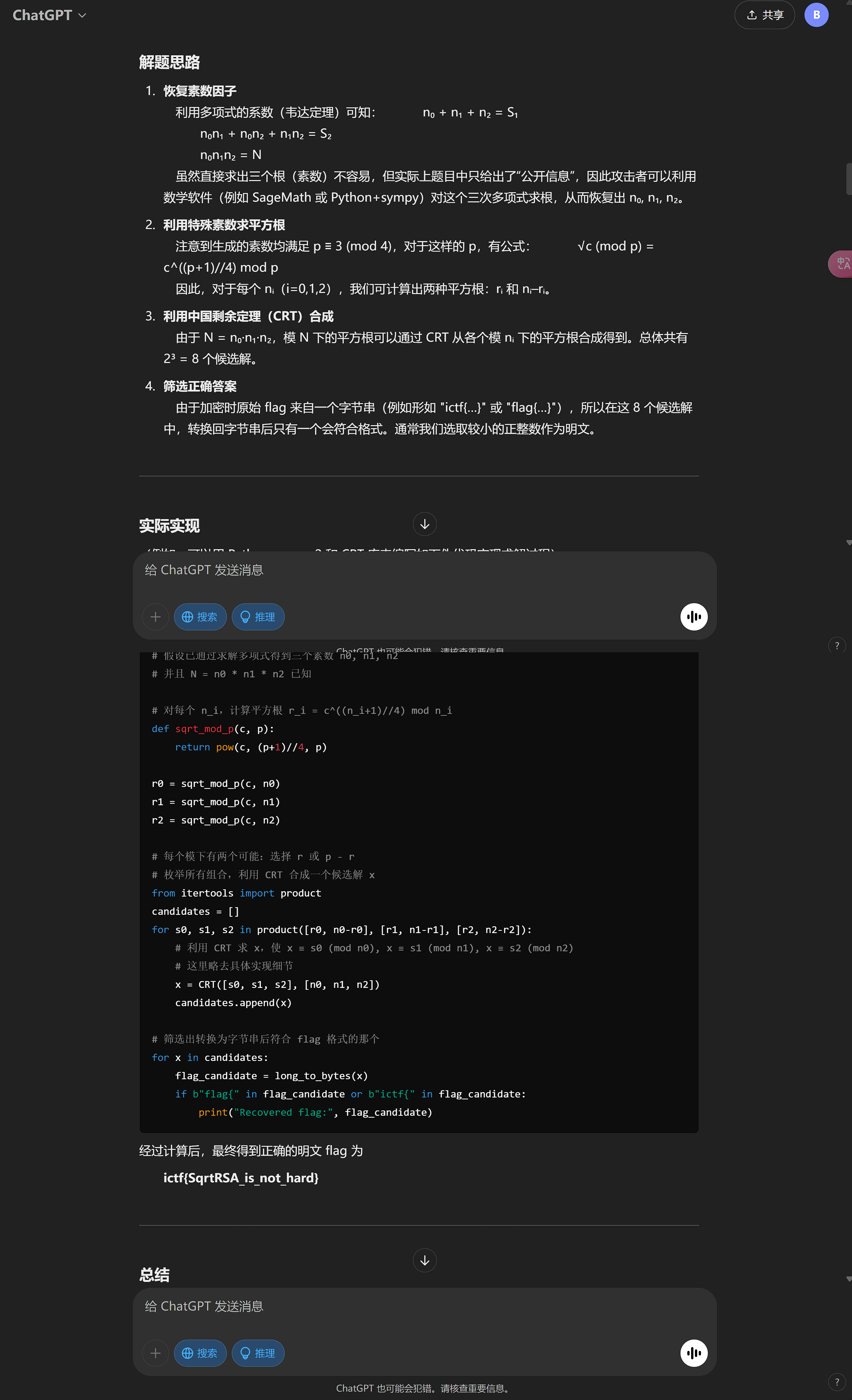 1 2 3 4 5 6 7 8 9 10 11 12 13 14 15 16 17 18 19 20 21 from Crypto.Util.number import *from secret import flagflag=bytes_to_long(flag) l=flag.bit_length()//3 + 1 n=[] N=1 while len (n) < 3 : p = 4 *getPrime(l)-1 if isPrime(p): n.append(p) N *= p print (f'c={flag*flag%N} ' )from sympy import symbols, expandx = symbols('x' ) polynomial = expand((x - n[0 ]) * (x - n[1 ]) * (x - n[2 ])) print (f'{polynomial=} ' )