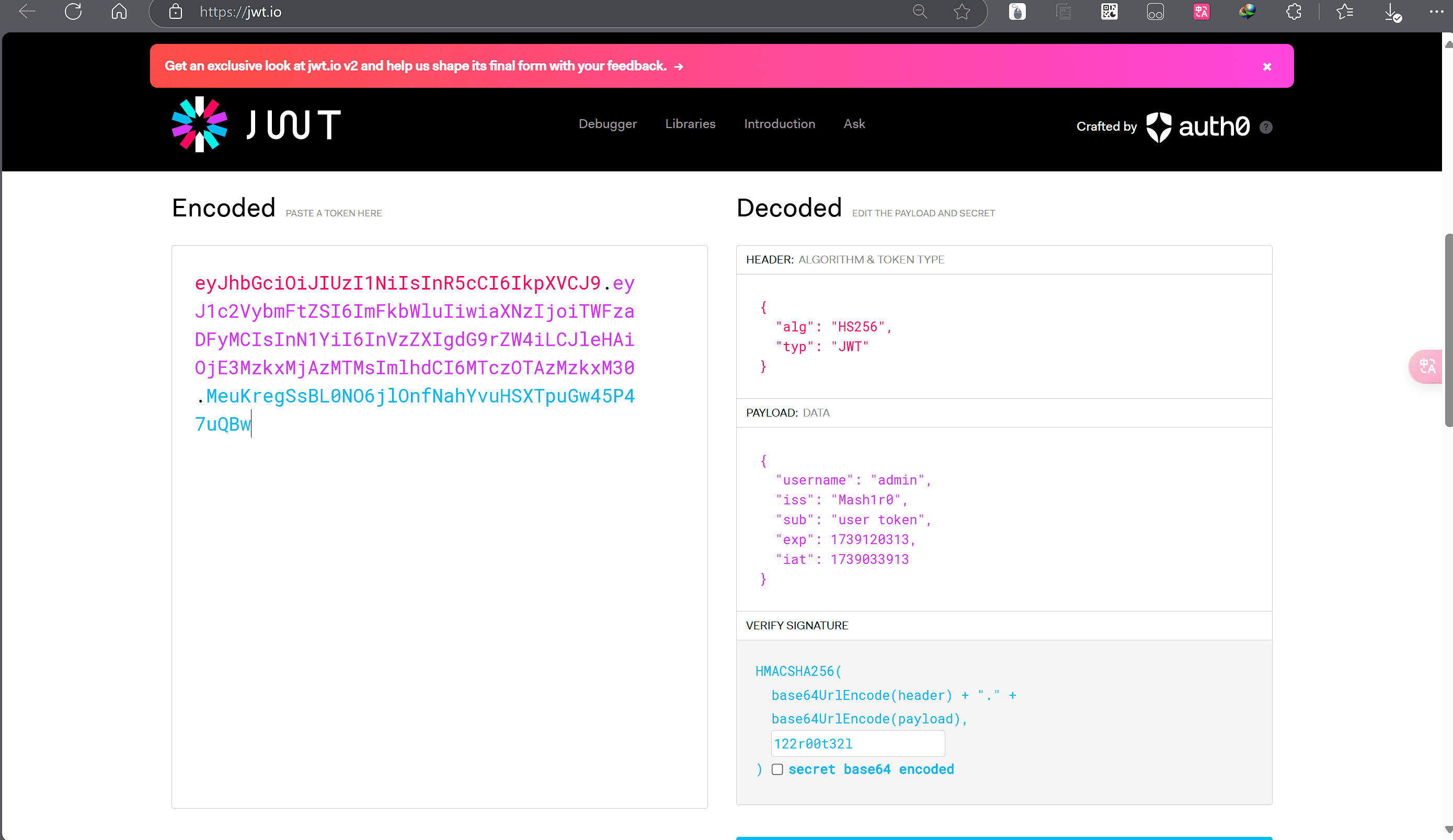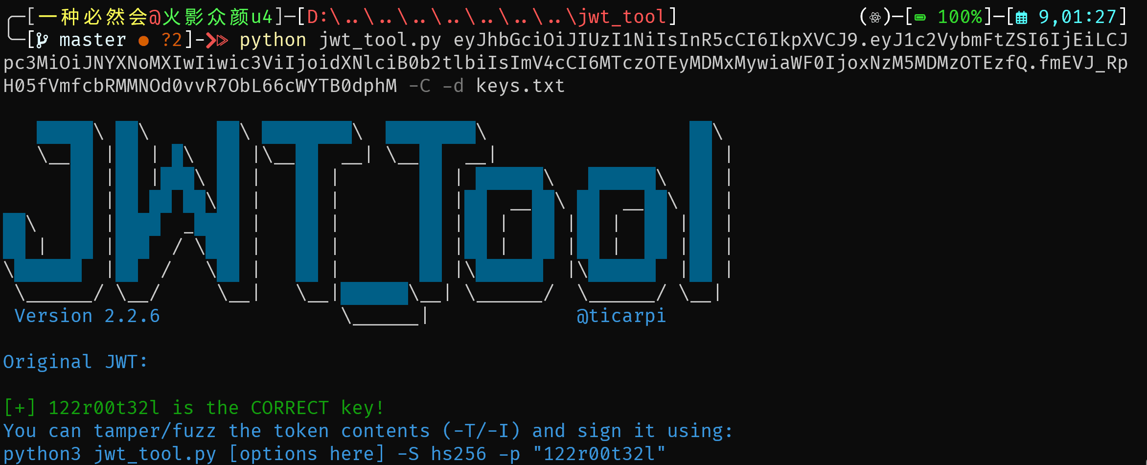 1 python jwt_tool.py eyJhbGciOiJIUzI1NiIsInR5cCI6IkpXVCJ9.eyJ1c2VybmFtZSI6IjEiLCJpc3MiOiJNYXNoMXIwIiwic3ViIjoidXNlciB0b2tlbiIsImV4cCI6MTczOTEyMDMxMywiaWF0IjoxNzM5MDMzOTEzfQ.fmEVJ_RpH05fVmfcbRMMNOd0vvR7ObL66cWYTB0dphM -C -d keys.txt