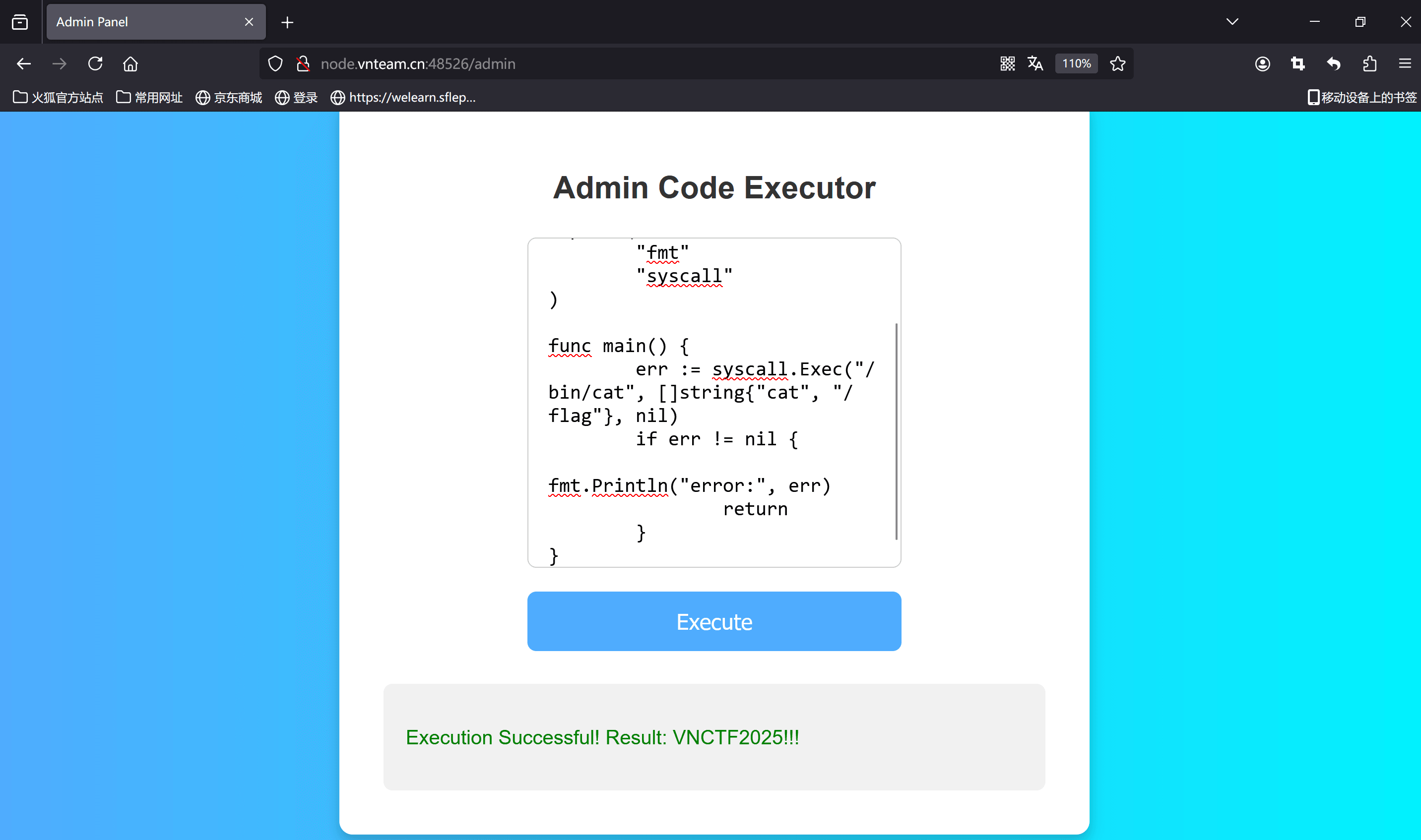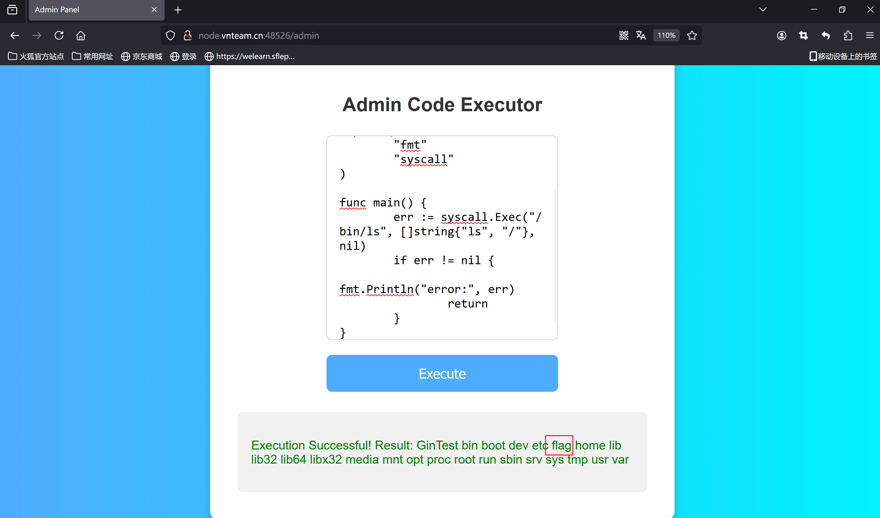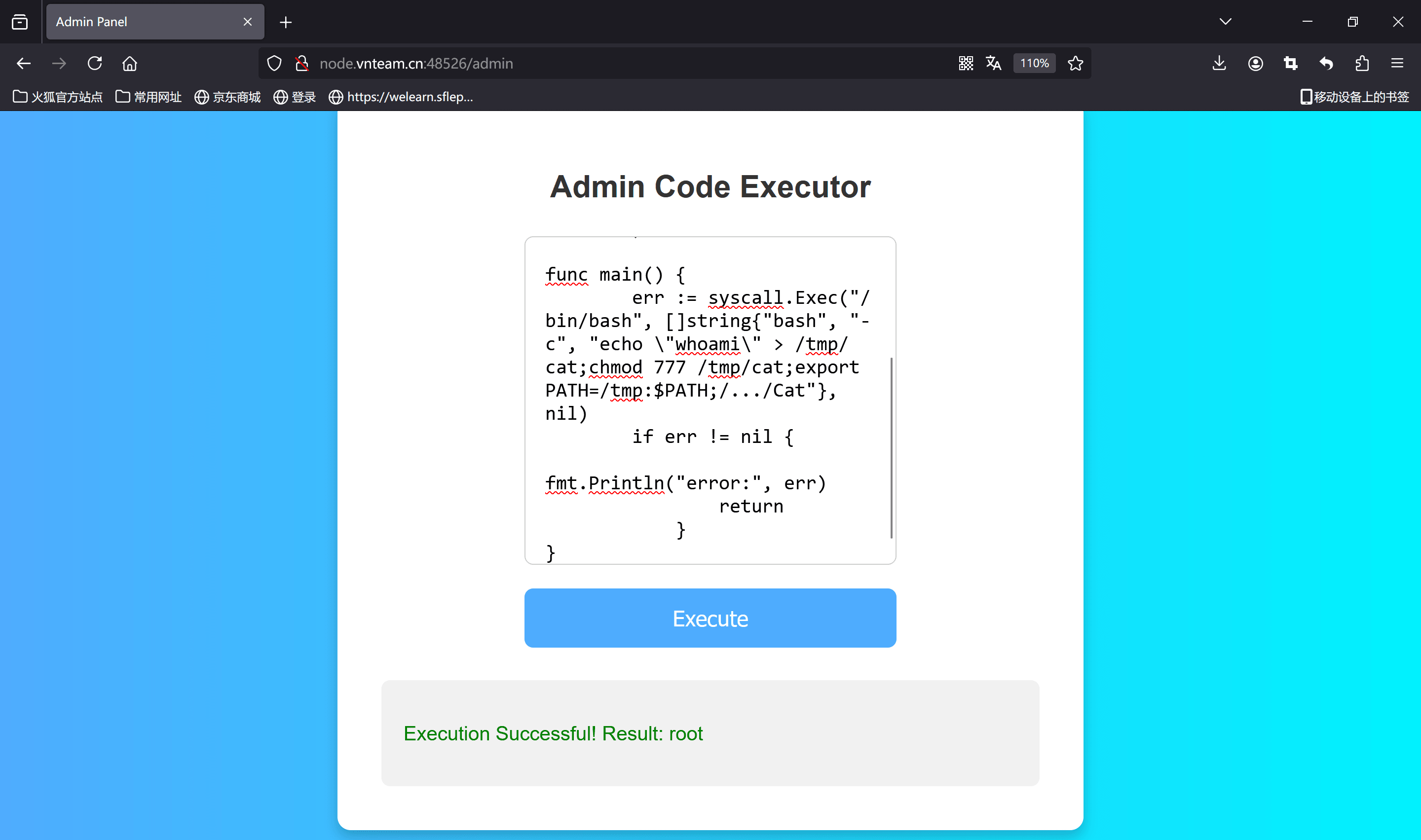 现在可以访问/admin路由了!其中可以执行go代码,存在过滤: