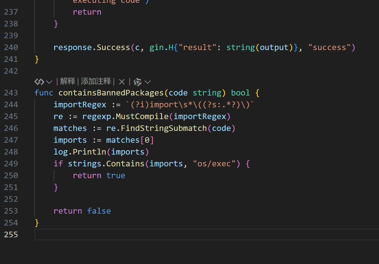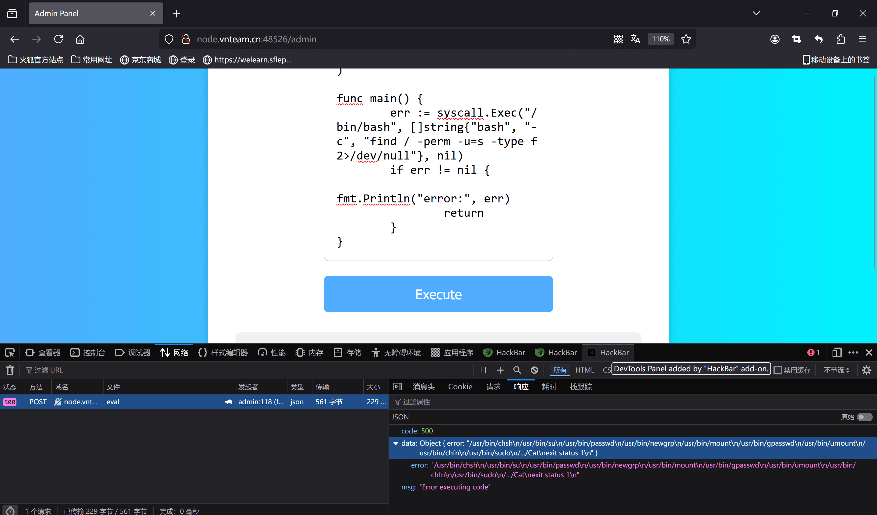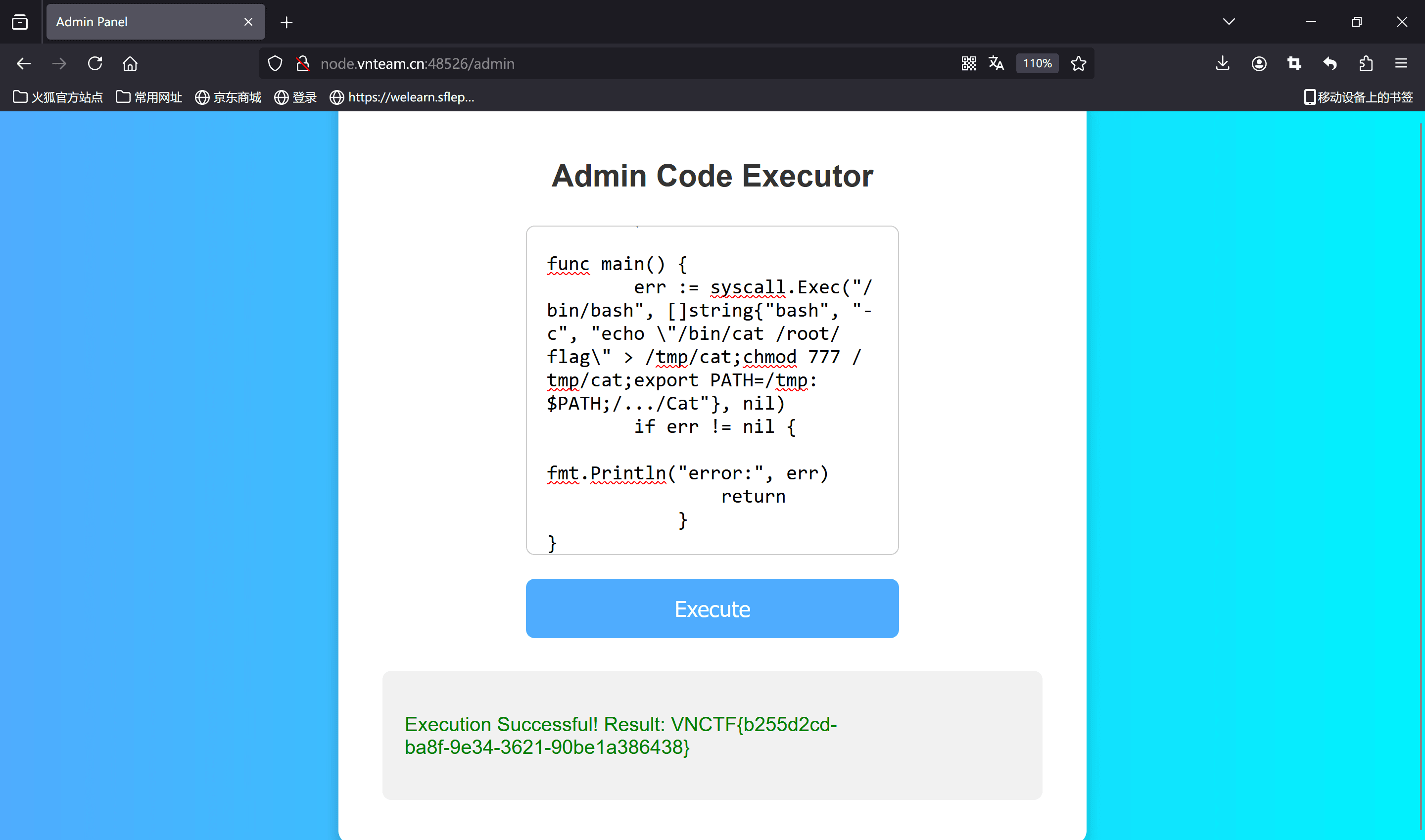 现在可以访问/admin路由了!其中可以执行go代码,存在过滤: